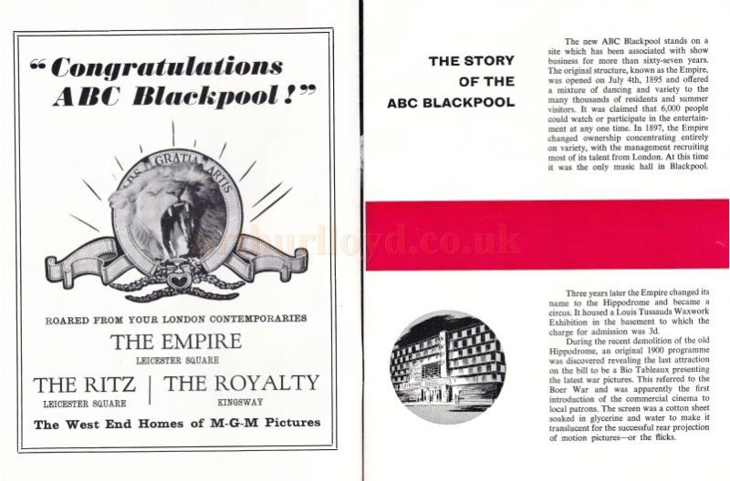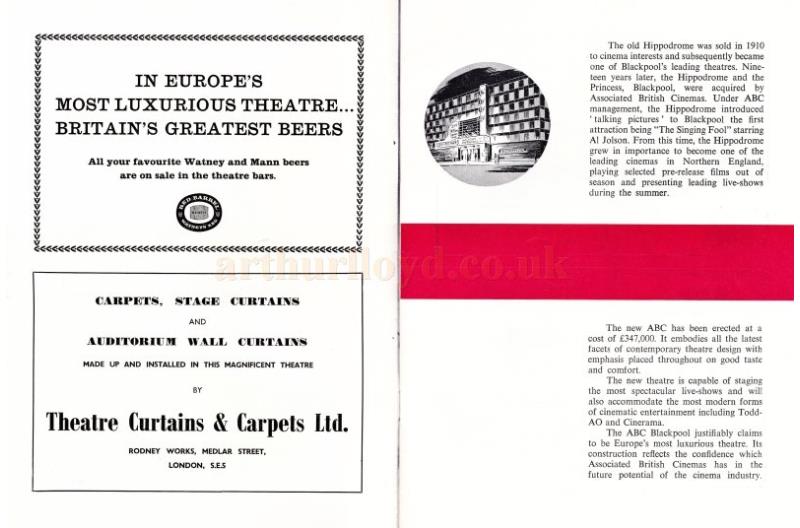 The ABC was used for stage shows in the summer seasons and films and concerts in the winter. The Theatre was also used by ABC Weekend Television who broadcast their 'Blackpool Night Out' variety shows from the Theatre during the 1960s, see the 1965 'Blackpool Night Out' programme below.