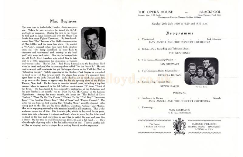 Shown left is a Summer Season programme cover for George and Alfred Black's 'The Big Show' at the Opera House, Blackpool in 1955 which was kindly Donated by Pam Prior. On the Bill for this production were Alma Cogan, Jimmy Jewel, Ben Warriss, The Flying de Pauls, The John Tliler Girls, Barbara Evans, Odette Crystal, Janet Grey, and the 'Augmented Opera House Orchestra' under the direction of Harry Hudson. George and Alfred Black's 'Big Show' Summer Seasons were produced at the Blackpool Opera House for many years and more of these programmes can be seen below.