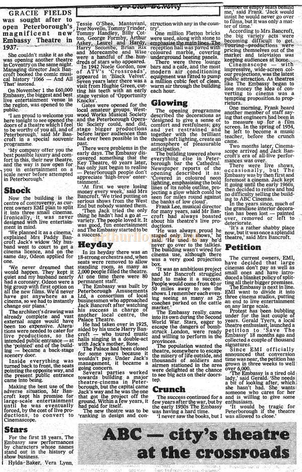 If we don't support ... then ... ? ... 2 or even 3, into 1, unfortunately will go. I hope you have enjoyed this brief nostalgic trip 'down memory lane', and hope that you will continue to support this theatre, to ensure its future in its present form. It would be a great pity for Peterborough to lose yet another theatre- one which has stood the test of time after the old Theatre Royal and Empire closed its doors. Watch out for all theatre advertising, under the name of the ABC EMBASSY.