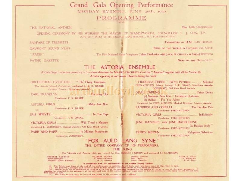 Above - Details of the Opening Night Production at the Streatham Astoria, June 30th 1930 - Courtesy Ron Knee Archive.